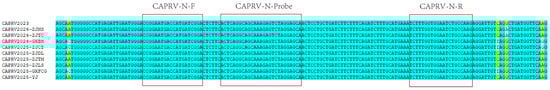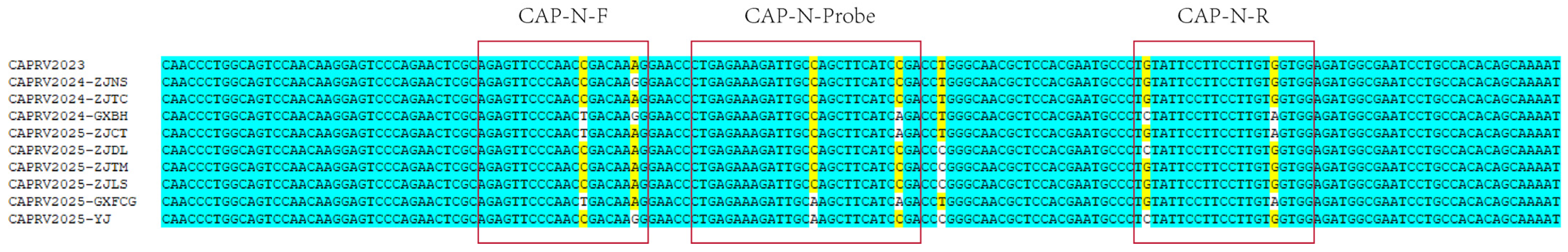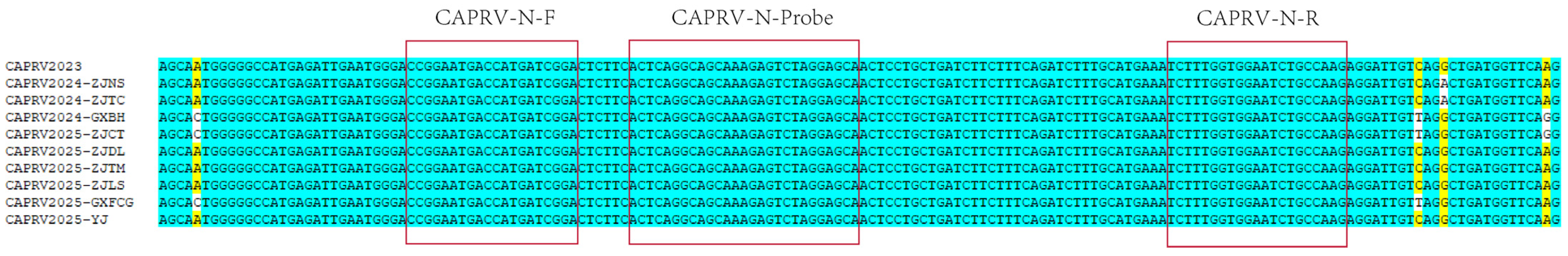 https://www.genscript.com.cn/tools/real-time-pcr-taqman-primer-design-tool, accessed on 1 November 2025) with the following parameters: PCR amplicon size 50–200 bp, primer Tm 52–60 °C, and probe Tm 62–70 °C, and potential self-complementarity and primer-dimer formation were evaluated. The resulting qPCR primers, CAPRV-N-F and CAPRV-N-R, together with the TaqMan probe (CAPRV-N-Probe), target a 110 bp amplicon within a conserved central region of the N gene, ensuring specificity and sensitivity for CAPRV detection. BLAST (