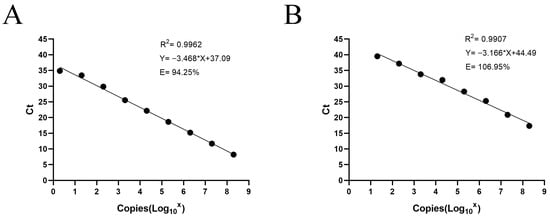 2 > 0.99) and efficiencies within the 90–110% range, confirming the quantitative reliability of the method. The sensitivity of RNA standards is inferior to that of plasmid standards, which is consistent with previous reports on other viral qPCR assays. This is because the reverse transcription step required for RNA introduces additional variability and potential template loss, resulting in higher detection limits than those observed with plasmid-based standards. Consequently, relying solely on plasmid standards may underestimate the true concentration of RNA targets [
