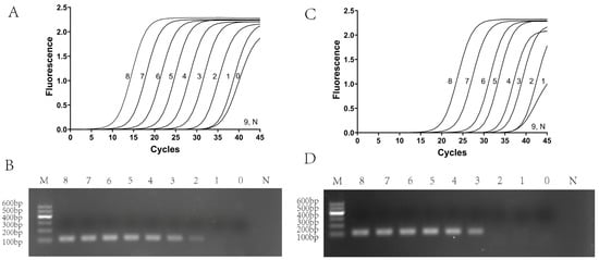 Simultaneously, the sensitivity of conventional PCR was investigated utilizing the same plasmid DNA and in vitro-transcribed RNA templates. Initially, RNA standards were reverse-transcribed into cDNA using the HiScript IV 1st Strand cDNA Synthesis Kit (+gDNA wiper) (Vazyme, China) prior to their amplification. PCR assays were executed with the 2× Rapid Taq Plus Master Mix (Dye Plus) (Vazyme, China), following a thermal profile that commenced with an initial denaturation at 95 °C for 2 min, proceeded with 35 cycles of 98 °C for 10 s, 55 °C for 30 s, and 68 °C for 10 s, and concluded with a final extension at 68 °C for 5 min.