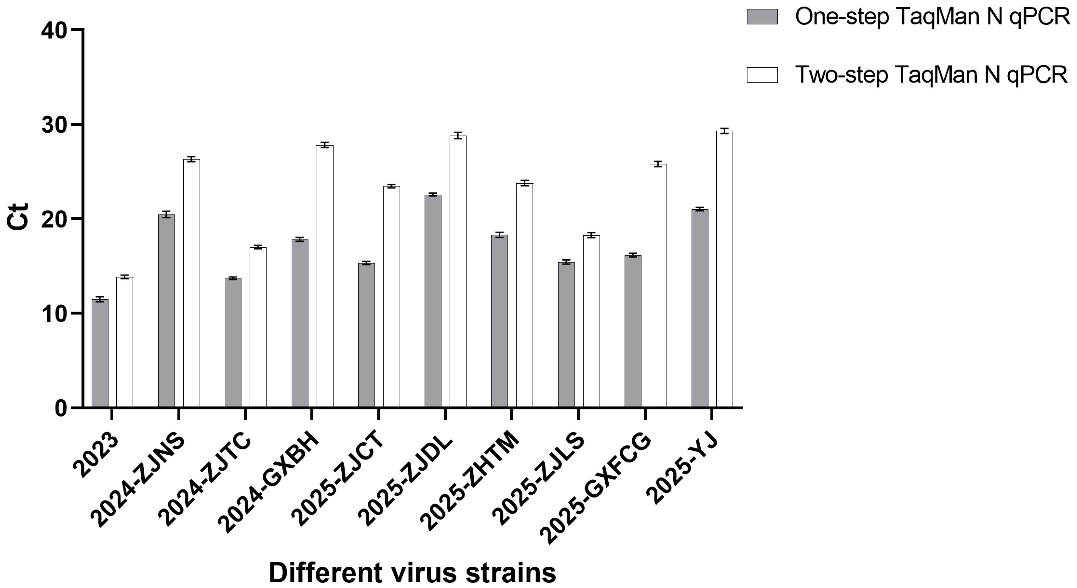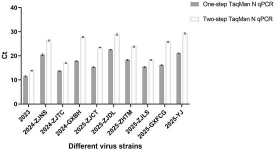 21]. Comparative analysis of the N gene sequences from ten representative isolates revealed that several strains contained mismatches at the primer and probe binding sites of the previous two-step assay, whereas the conserved regions targeted by the newly developed one-step assay showed no such mismatches. When these isolates were tested using both assays, the one-step method consistently produced lower Ct values across all strains. This observation suggests that the improved detection performance of the one-step assay may be influenced by both the avoidance of primer/probe mismatches in some strains and the different methodological factors. Indeed, studies in other viral systems have shown that one-step RT-qPCR outperforms two-step RT-qPCR, producing significantly lower Ct values [