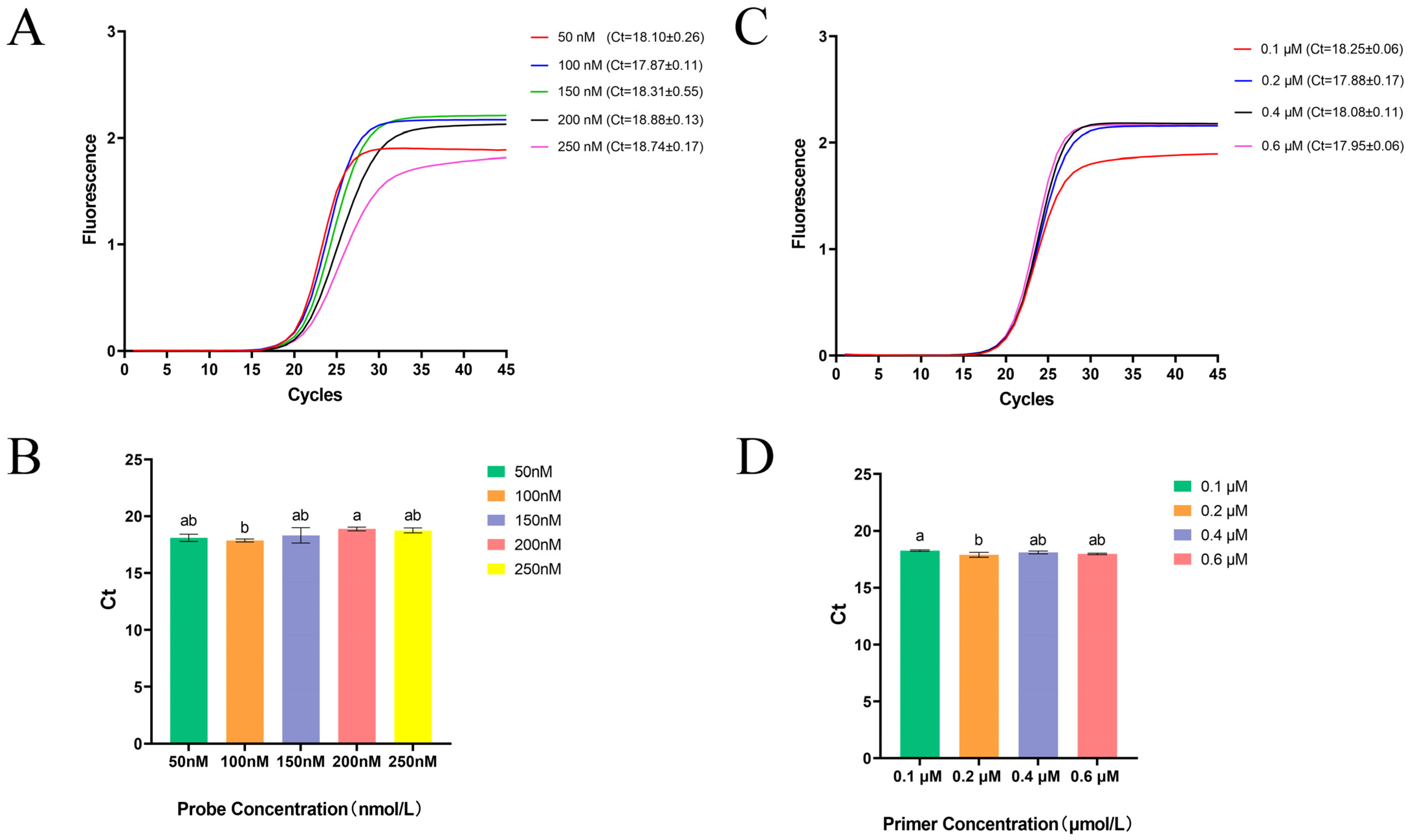 To determine the optimal probe and primer concentrations, a series of reactions was first performed using different probe concentrations of 50 nM, 100 nM, 150 nM, 200 nM, and 250 nM while maintaining constant primer concentrations of 0.2 μM. After the optimal probe concentration was identified, primer concentrations were further optimized at 0.1 μM, 0.2 μM, 0.4 μM, and 0.6 μM. Each reaction was performed in triplicate using the LightCycler® 96 Real-Time PCR System (Roche, Solna, Sweden). The optimal reaction conditions were defined as those yielding the lowest threshold cycle (Ct) values, relatively higher amplification efficiency, and lower standard deviation (SD). These optimized parameters were subsequently applied to all downstream analyses.