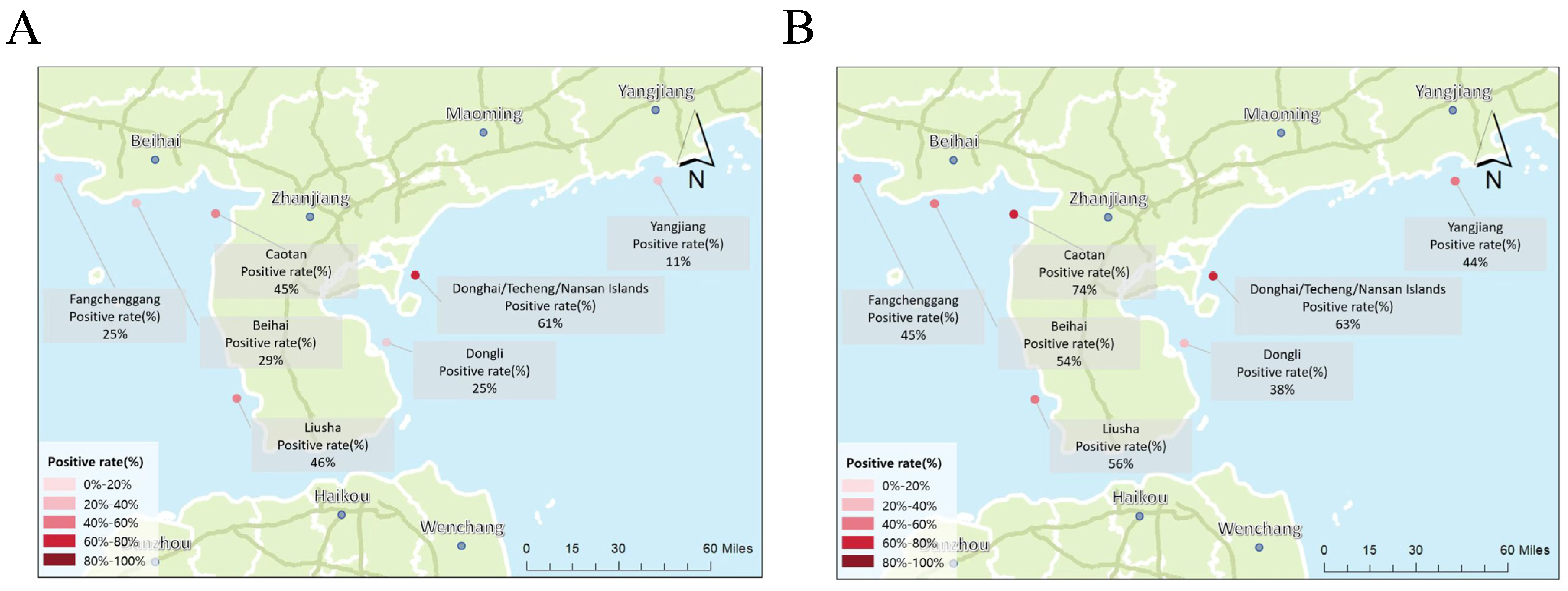 Field application further demonstrated the assay’s practical value for epidemiological surveillance and pathogen distribution analysis. A total of 257 golden pompano samples were collected from multiple coastal aquaculture sites in Guangdong and Guangxi provinces and tested for CAPRV RNA. These samples were simultaneously analyzed using the one-step TaqMan qPCR assay, which targets the N gene and conventional PCR developed in this study, and two-step TaqMan qPCR assay, which targets the N gene by Huang et al. [