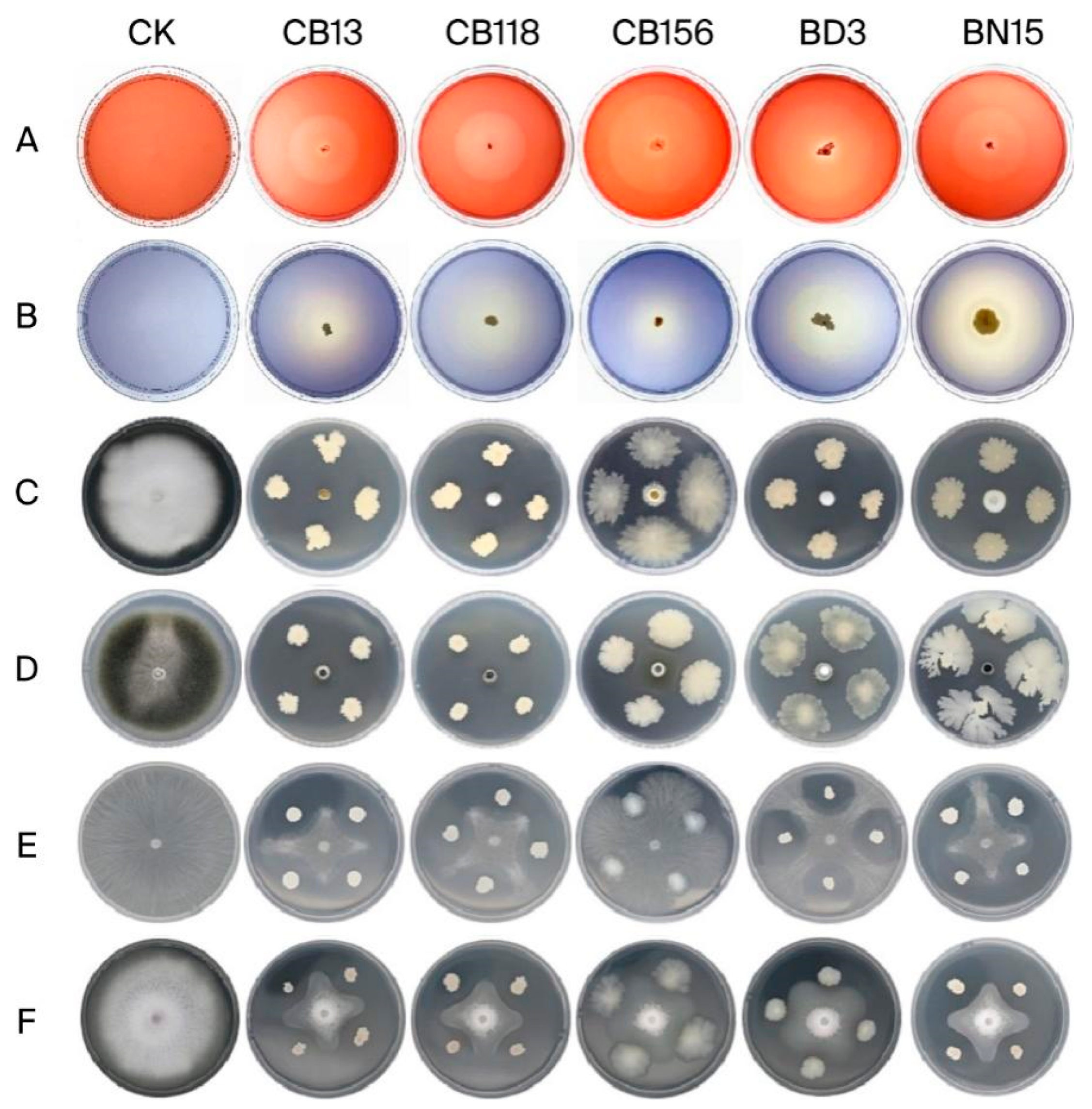 - Cheng, C.; Su, S.F.; Bo, S.L.; Zheng, C.Z.; Liu, C.F.; Zhang, L.C.; Xu, S.H.; Wang, X.Y.; Gao, P.F.; Fan, K.X.; et al. A Bacillus velezensis strain isolated from oats with disease-preventing and growth-promoting properties. Sci. Rep. 2024, 14, 12950. [Google Scholar] [CrossRef] [PubMed]
