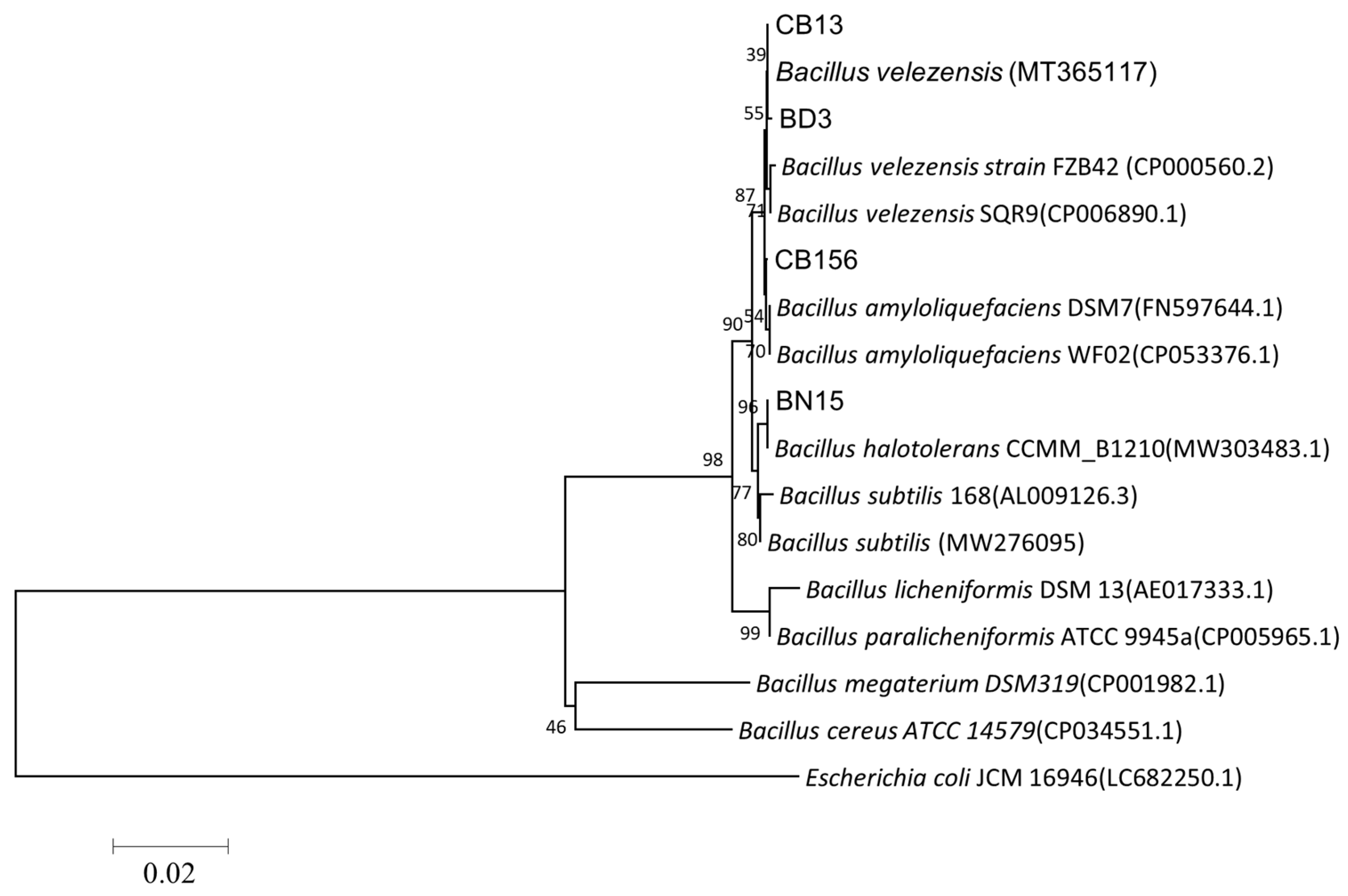 | CB156 | Oval Milky-white Opaque Smooth edges | ![]() | 16S rRNA: PP809059 gyr B: PX767074 | Bacillus amyloliquefaciens |