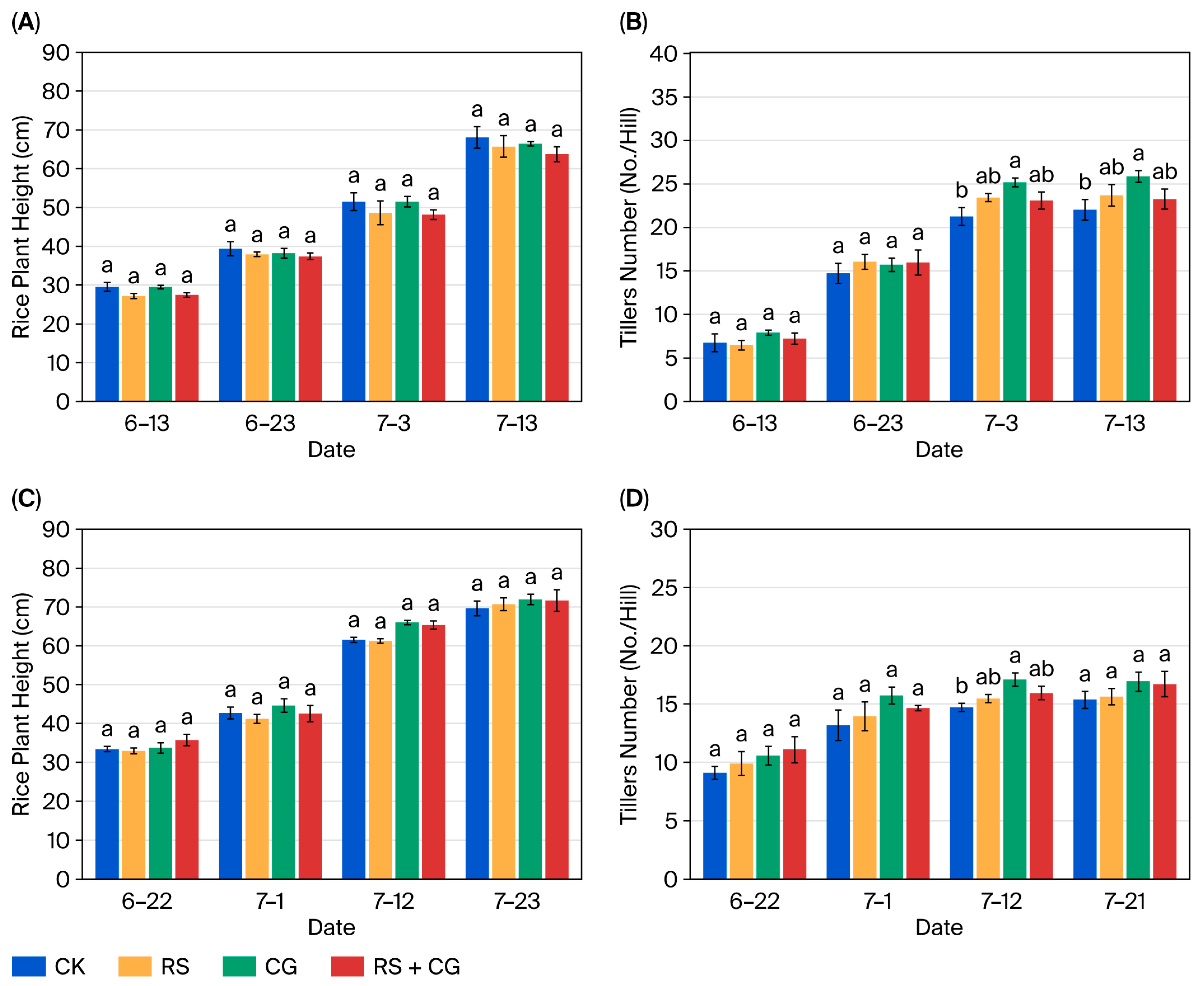 | RS + CG | 429.20 ± 13.42 ab | 118.88 ± 7.27 a | 21.77 ± 0.18 a | 92.44 ± 1.21 a | 9822.52 ± 116.13 a | 6.75 |