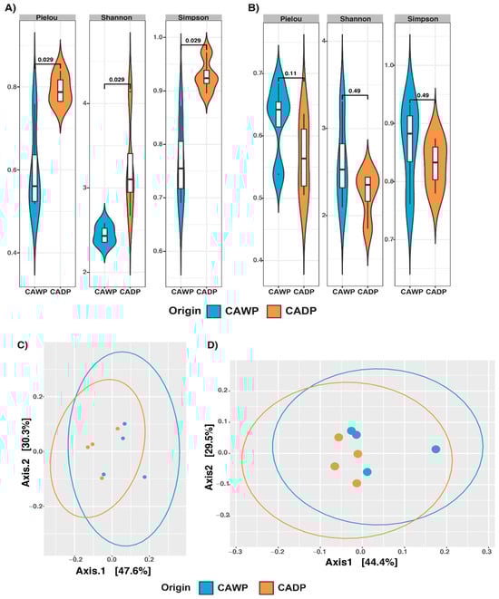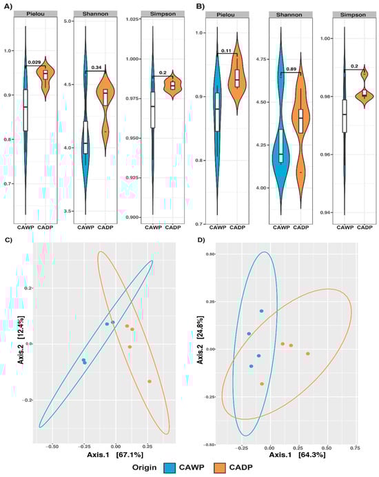Alpha diversity Pielou, Shannon, and Simpson and principal coordinate analysis (PCoA) plot of beta diversity based on weighted UniFrac distance derived from sequencing data on microbiota between Central Andean Dry Puna and Central Andean Wet Puna groups. (A) Bacterial alpha diversity microbiota index. (B) Microbiota index of archaea alpha diversity. (C) Beta diversity of bacterial (D) Beta diversity of archaea. CADP = Central Andean Dry Puna, CAWP = Central Andean Wet Puna.