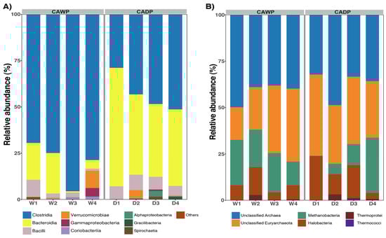 Relative abundances were observed in CAWP and CADP groups. Only the most represented taxa are presented. (A) Relative abundance of the most predominant classes in bacteria. (B) Relative abundance of the most abundant classes in archaea. CADP = Central Andean Dry Puna, CAWP = Central Andean Wet Puna.