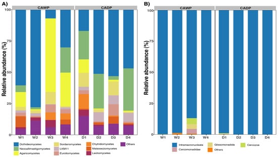 Relative abundances were observed in CAWP and CADP groups. Only the most represented taxa are presented. (A) Relative abundance of the most predominant classes in fungi. (B) Relative abundance of the most abundant classes in protists. CADP = Central Andean Dry Puna, CAWP = Central Andean Wet Puna.