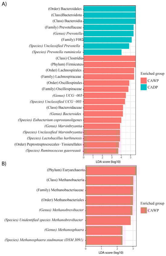 Differences in the intestinal bacterial and archaea microbiota between CAWP and CADP alpaca groups. Bar chart of linear discriminant analysis (LDA) for differentially abundant genera: (A) Bacteria in CAWP versus CADP; (B) Archaea only in CAWP. CADP = Central Andean Dry Puna, CAWP = Central Andean Wet Puna.