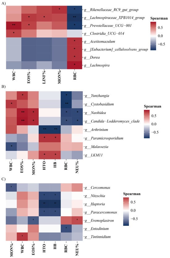 Spearman correlation heatmap between intestinal microbial genera and hematological variables. * p < 0.05; ** p < 0.01. (A) Heatmap for bacterial genera, (B) heatmap for fungal genera, and (C) heatmap for protist genera.