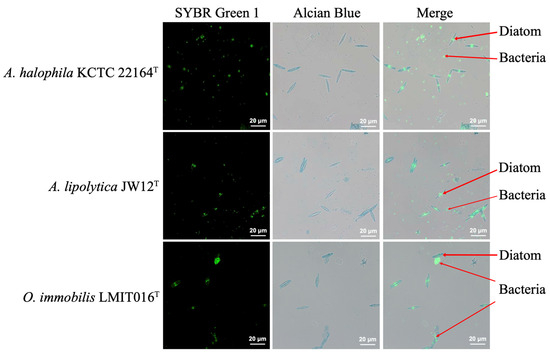 To further investigate the physical interactions underlying the different growth responses of LMIT016T and the reference strains, we assessed the morphology of microalgal-bacterial co-culture using combined bright-field and fluorescence microscopy. The results demonstrated that a substantial number of LMIT016T cells adhered to the diatom surface, forming dense aggregates. In contrast, cells of strains JW12T and KCTC 22164T remained predominantly free-living and dispersed away from the diatoms (Figure 2 and Figure S1). Quantitative analysis confirmed a significant difference in attachment density among the three strains (p = 0.02, Kruskal–Wallis test, Figure S2). Specifically, strain LMIT016T exhibited a higher adhesion density (0.4786 ± 1.4883 cells/µm2) than those of JW12T (0.0385 ± 0.0487 cells/µm2) and KCTC 22164T (0.0059 ± 0.0116 cells/µm2). These observations suggested that LMIT016T adopts an attachment-oriented lifestyle, which may underlie its distinct growth behavior in the co-culture.