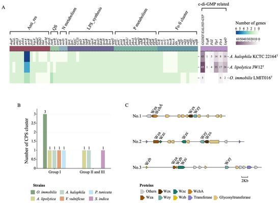 Functional annotation of genes involved in marine bacterial interactions. (A) Gene sets mediating marine bacterial–host and bacterial–bacterial interactions annotated in genomes of strains LMIT016T, KCTC 22164T and JW12T. Color intensity corresponds to the number of genes per strain. (B) Number of different capsular systems identified in each strain. (C) Annotation of three capsule single loci within the genome of strain LMIT016T.