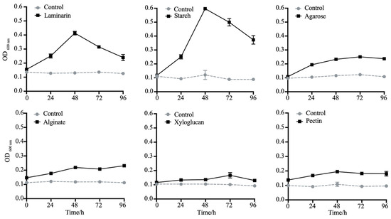 Growth of strain LMIT016T on selected polysaccharides as the sole carbon source. Bacterial growth was measured by optical density(OD600) in modified basal medium supplemented with 0.1% (g/v) of each polysaccharide. Tested substrates include laminarin, starch, agarose, pectin, alginate, and xyloglucan. Solid lines represent bacterial growth on each polysaccharide; dotted lines represent the control (growth in carbon-free basal medium). Data are expressed as mean ± SD of three technical replicates.