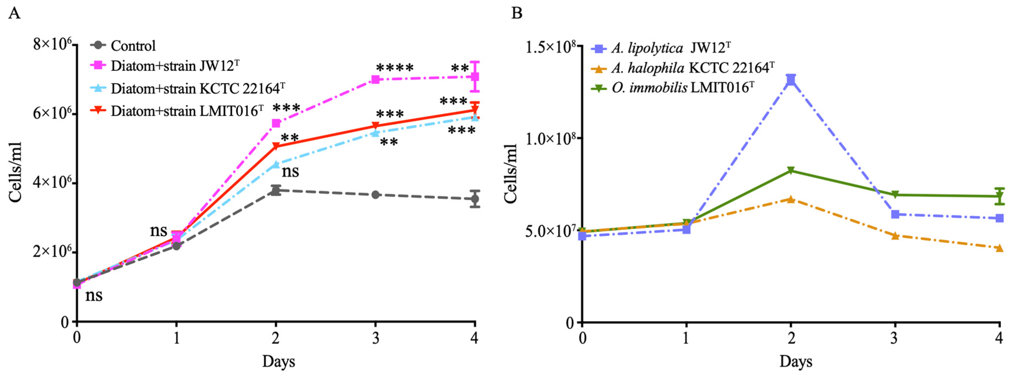 3.1. Strain LMIT016T Exhibited the Steadiest Growth While Benefiting the Diatom