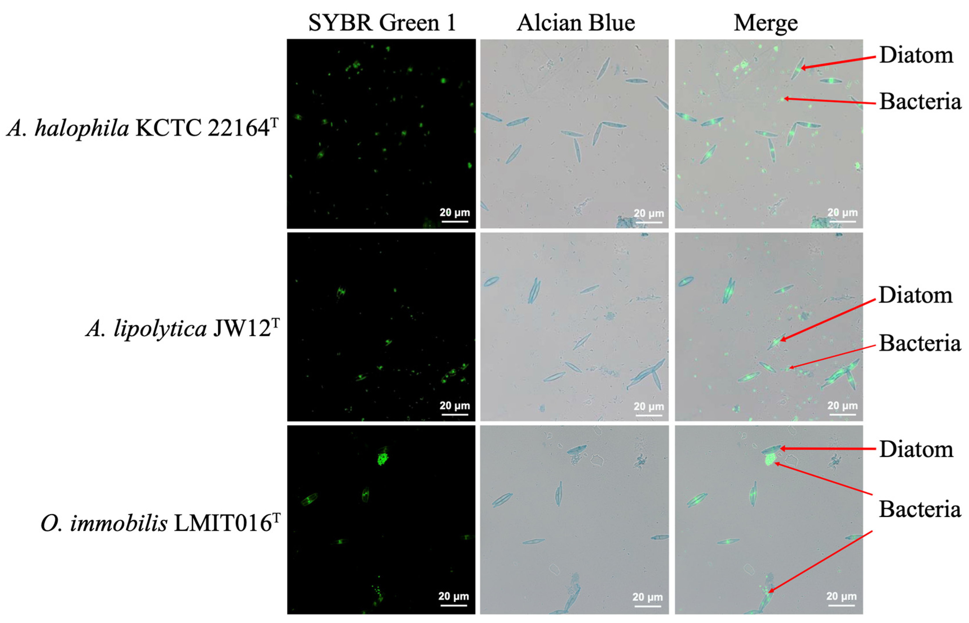 - Amin Shady, A.; Parker Micaela, S.; Armbrust, E.V. Interactions between Diatoms and Bacteria. Microbiol. Mol. Biol. Rev. 2012, 76, 667–684. [Google Scholar] [CrossRef]