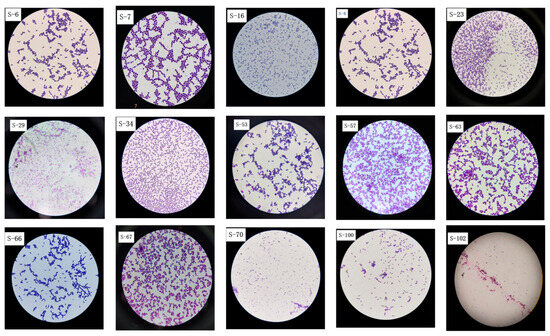 Thirty-two suspected LAB colonies were initially isolated from the traditionally fermented Sayram yogurt samples. On the plate, the colonies appeared milky white or milky yellow and round. Most colonies were small, convex, moist, and viscous with smooth surfaces, while a few were larger. After Gram staining, 15 strains were identified as catalase-negative and Gram-positive. Under a light microscope, as shown in Figure 1, these strains appeared blue-purple, rod-shaped, spherical, and were either arranged side by side or scattered.