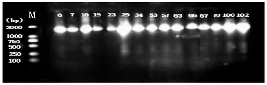 DNA isolation and 16S rDNA gene PCR amplification were conducted on 15 presumptive LAB strains. The results of agarose gel electrophoresis (Figure 2) showed that all strains exhibited clear, specific bands at approximately 1000 bp, indicating that the amplification reaction was successful.