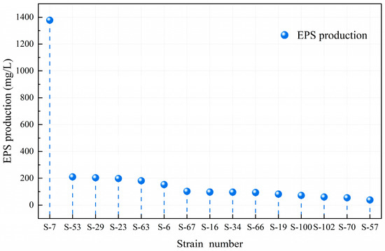 EPS is a beneficial compound produced by LAB during fermentation [37]. Different strains exhibit significant differences in EPS production capacity due to their specific structure [38]. Figure 4 shows that Lacticaseibacillus paracasei S-7 excels in exopolysaccharide synthesis, producing up to 1378.13 mg/L, far surpassing other strains. This indicates its superior viscosity-producing traits under identical culture conditions. Lactobacillus delbrueckii subsp. bulgaricus S-53 ranks second with 210.22 mg/L, followed by Lacticaseibacillus paracasei S-29 and S-23, yielding 203.61 mg/L and 198.41 mg/L, respectively. Lactobacillus delbrueckii subsp. bulgaricus S-63 produces 181.42 mg/L. The yield of Lactiplantibacillus plantarum S-6 was 153.09 mg/L. Other strains exhibit comparatively lower exopolysaccharide production. This study utilized the screening criteria established by Wa et al. [39]. in related research, setting an initial threshold of 150.00 mg/L for EPS yield to identify high-yield strains. Based on this criterion, six high-yield LAB (S-6, S-7, S-23, S-29, S-53, and S-63) were selected from the isolated strains, and their probiotic properties were subsequently assessed.