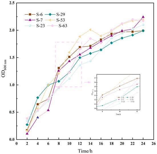 The growth kinetics curve of six strains of LAB in 24 h. The data were expressed as the absorbance (OD600) measured every 2 h, and the solid lines of different colors in the figure corresponded to the growth curves of each strain.