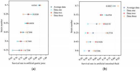 The gastrointestinal tolerance of 6 strains of LAB: (a) shows the survival rate in artificial gastric juice, and (b) shows the survival rate in artificial intestinal juice. The color points in the figure show 3 groups of repeated test data, and the gray points indicate the arithmetic mean of the survival rate of the corresponding strains.