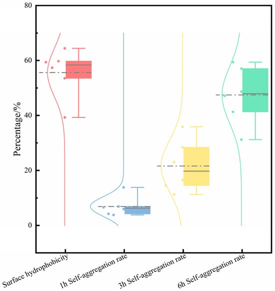 The surface hydrophobicity of six Lactobacillus strains along with their self-aggregation capabilities at 1, 3, and 6 h. Each box plot displays the interquartile range of the data, with the horizontal line inside representing the median value. The circular markers (•) and dashed lines indicate the mean values for each respective group.