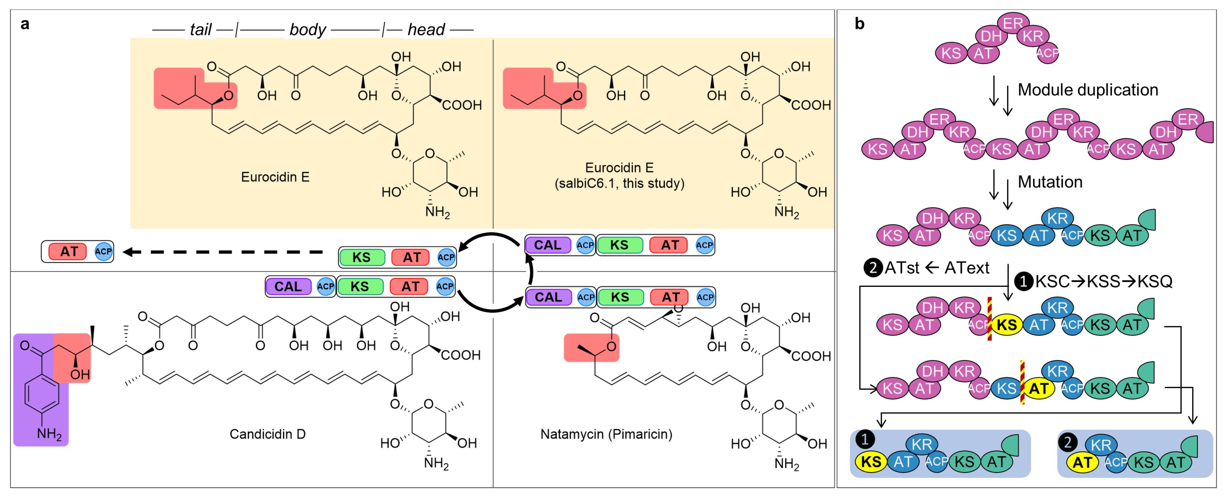Informed by this evolutionary insight into AT domain reprogramming, we next explored its potential for rational engineering of the candicidin pathway because its