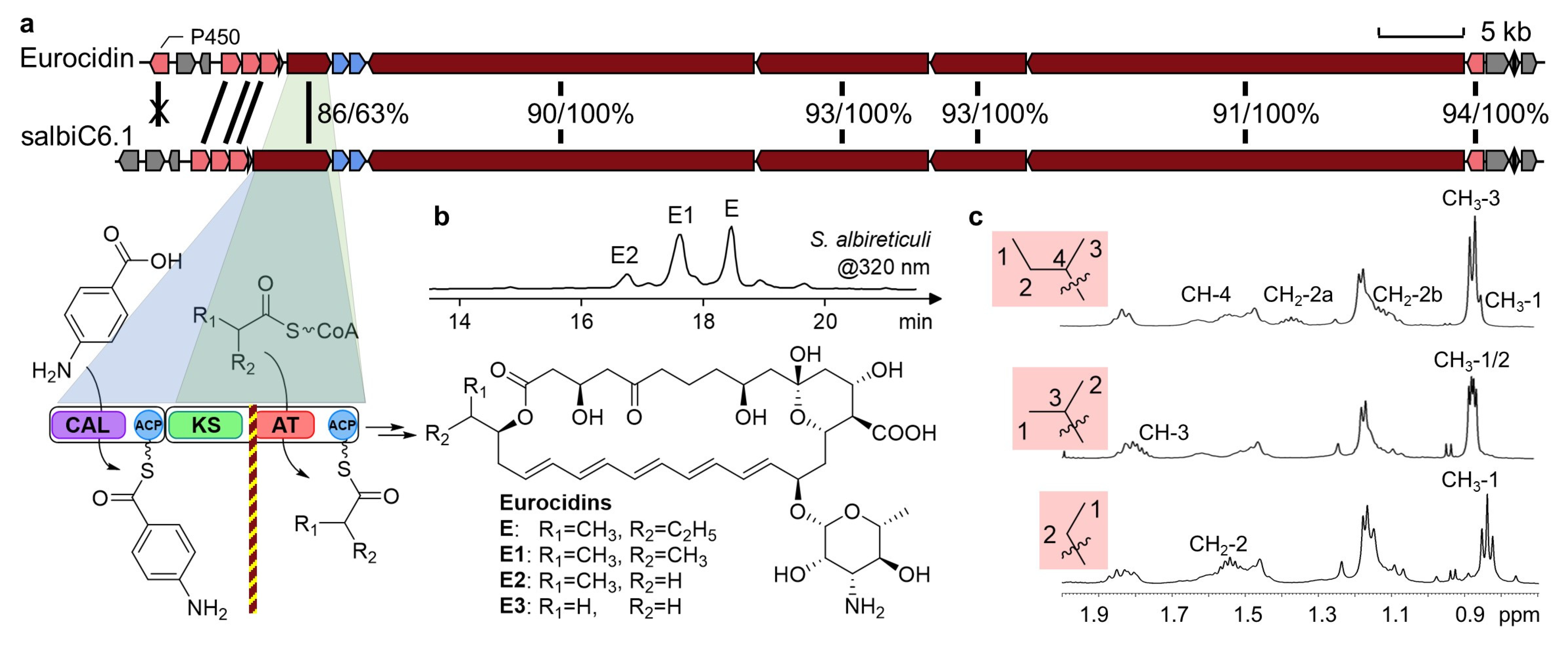 Figure 2). Cultivation of this strain yielded compounds with characteristic polyene UV-vis absorption, from which three pentaene products were isolated and characterized by NMR as eurocidins E [