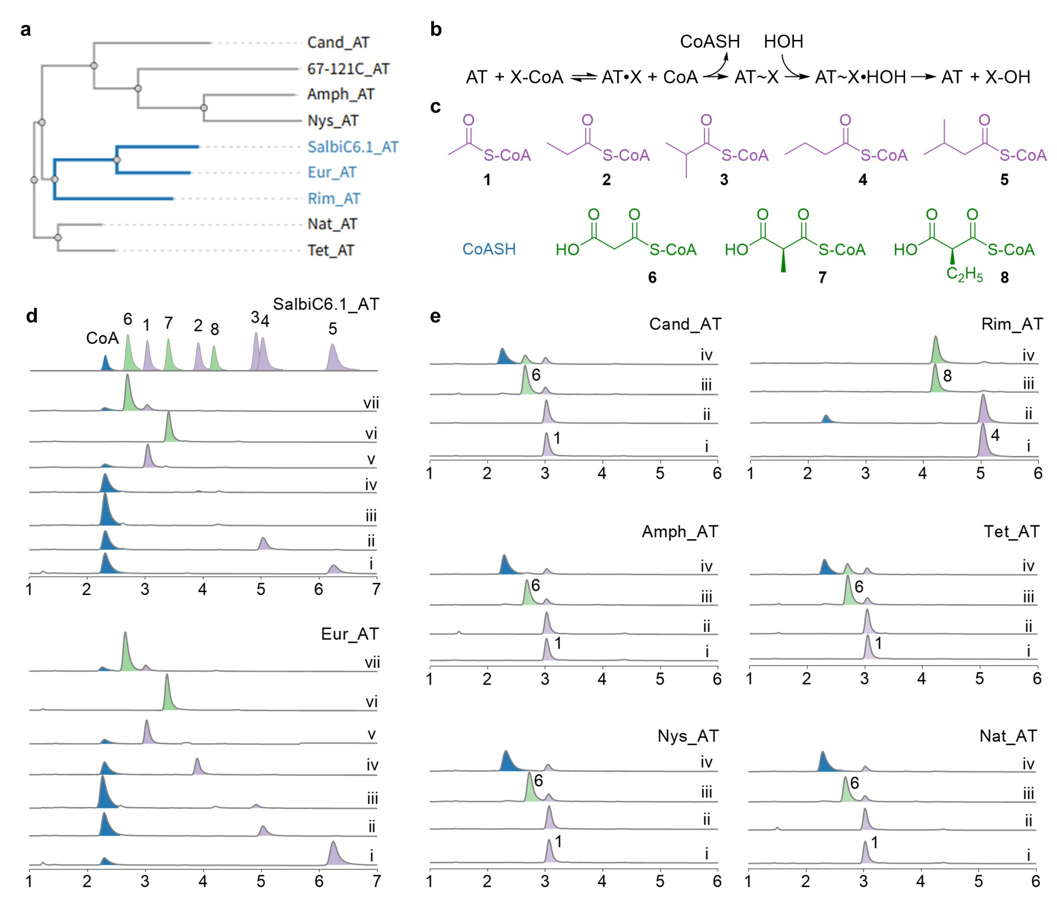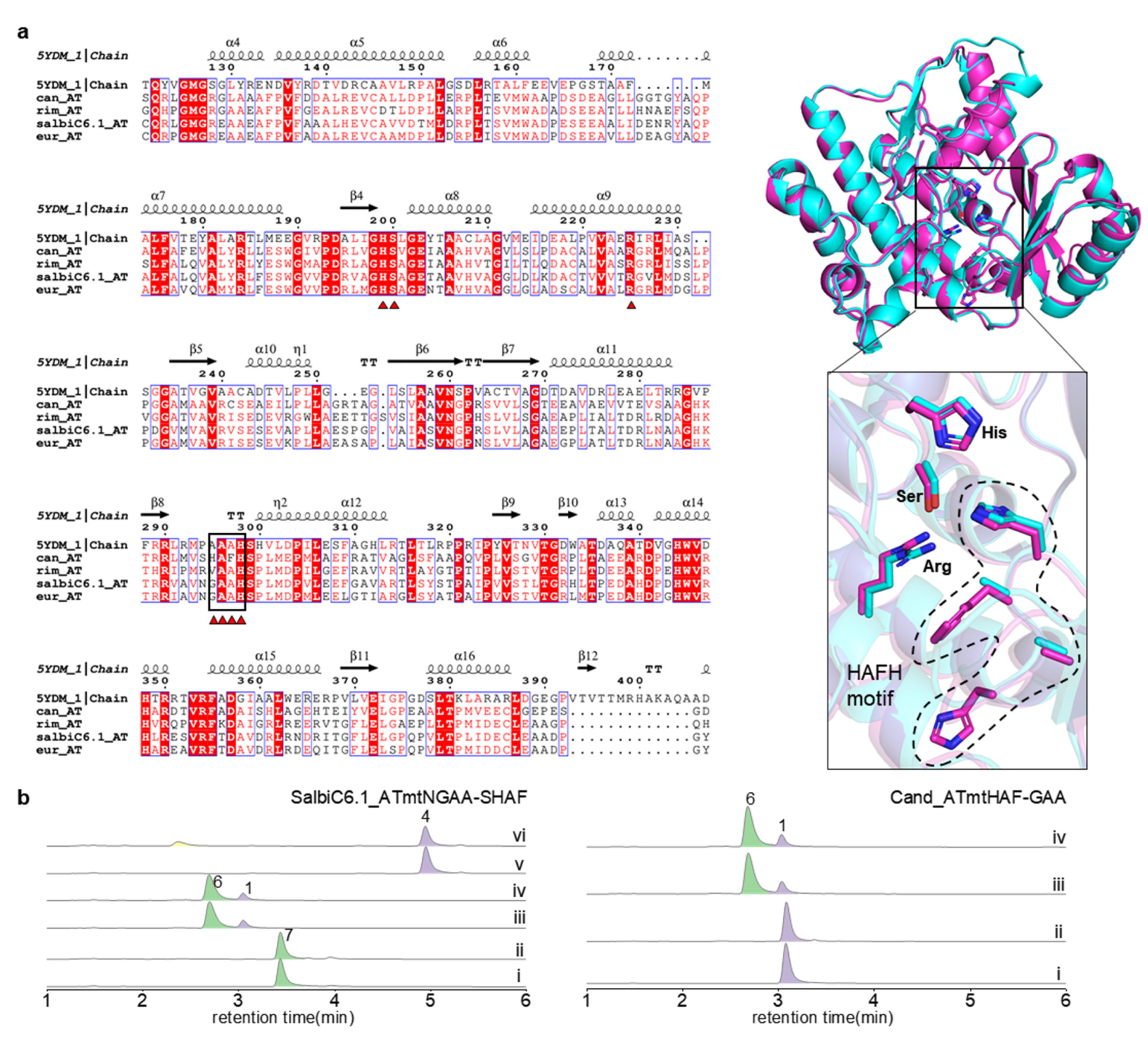 Sequence and structural analyses of AT domains and HPLC analysis of motif swapping mutants. Sequence alignment was performed by ENDscript server and 3D structures were modeled by AlphaFold3. (a) Sequence and structure alignment between Salbi_AT and Cand_AT. Triangles correspond to the AT’s critical active sites, and black border to the motifs involved in substrate binding. (b) The motif-swapping mutants exhibited an almost complete loss of activity toward the natural substrate while failing to acquire the expected noncognate activity. Control reactions (traces i, iii and v) used heat-inactivated enzyme.
