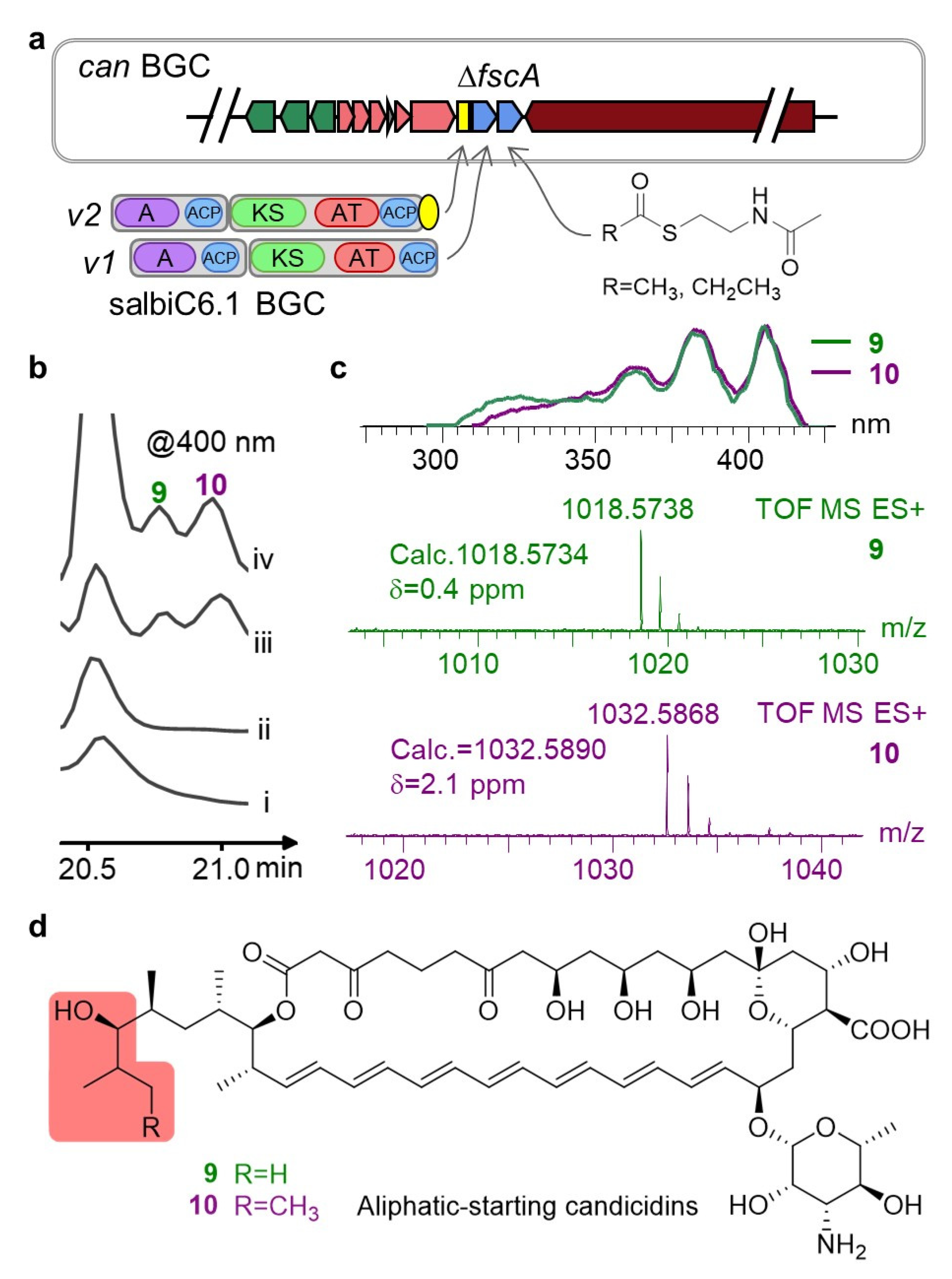 Figure 4a). Both complemented strains produced compounds displaying characteristic polyene UV absorption, and HRMS confirmed molecular weights corresponding to aliphatic-starting candicidin analogs (