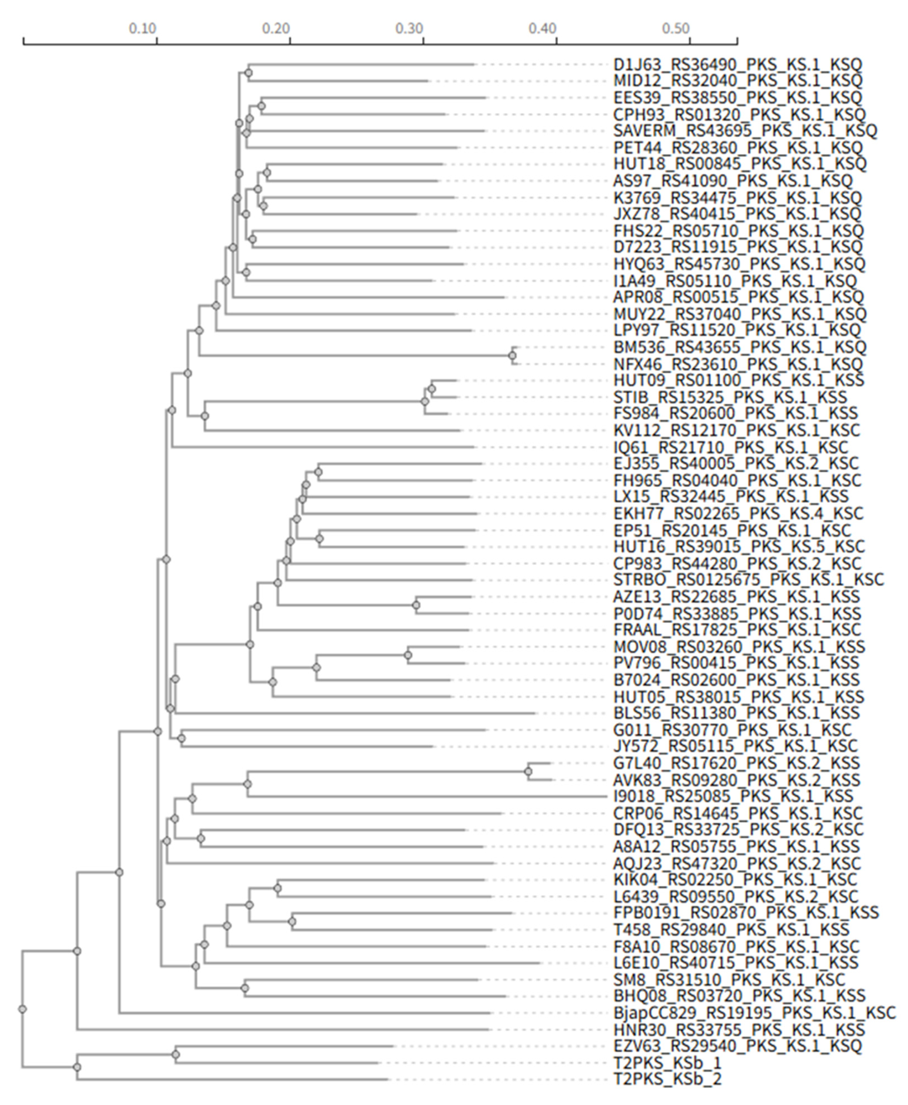 Phylogenetic analysis of KS domains from T1PKS BGCs. Sequences are collected from a local KS database containing KSC, KSS, and KSQ subtypes. For better inspection, 20 sequences from each subtype were randomly picked. With addition of 2 KS domains from T2PKS BGCs from Streptomyces coelicolor, all sequences were subjected to MUSCLE.