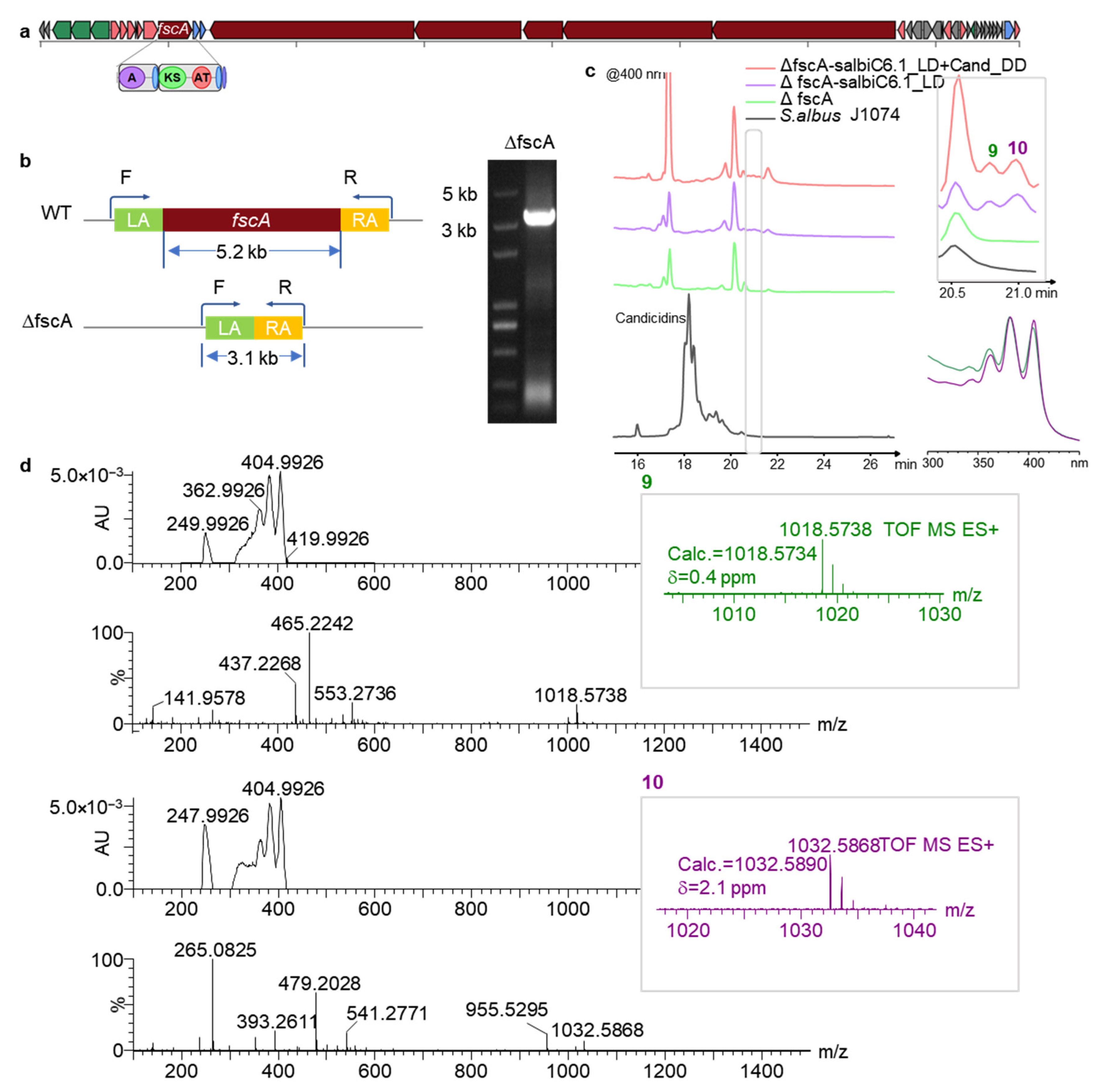 Metabolic profiling of loading module recombinants. (a) Composition of the candicidin biosynthetic gene cluster. (b) schematic of homologous double-crossover based knockout of fscA. (c,d) HPLC and HRMS analyses of polyene compounds.