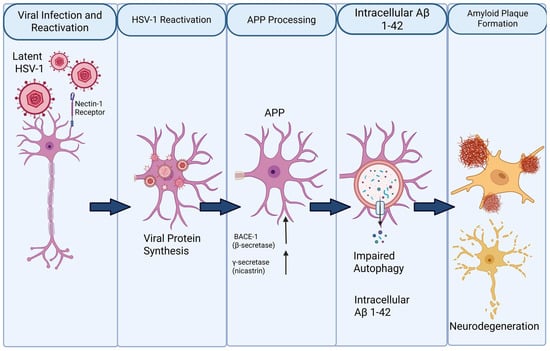 Proposed mechanism linking HSV-1 reactivation to amyloid-β (Aβ) pathology and neurodegeneration. Latent herpes simplex virus type 1 (HSV-1) persists in neurons and reactivates upon stress or immunological triggers through interaction with the nectin-1 receptor. Viral reactivation induces intracellular viral protein synthesis and alters host cellular pathways, including amyloid precursor protein (APP) processing. Up-regulation of β-secretase (BACE-1) and γ-secretase favors amyloidogenic cleavage of APP, leading to increased generation of Aβ, particularly the Aβ1–42 species. Concurrent impairment of autophagy reduces intracellular clearance, promoting accumulation of Aβ1–42 within neurons. Progressive intracellular Aβ burden contributes to extracellular amyloid plaque formation, synaptic dysfunction, and ultimately neurodegeneration.