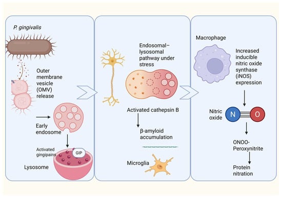 Proposed mechanism linking Porphyromonas gingivalis outer membrane vesicles to neuroinflammation, β-amyloid accumulation, and nitrosative stress. Porphyromonas gingivalis releases outer membrane vesicles (OMVs) containing virulence factors, including gingipains, which are internalized by neural cells through the endosomal–lysosomal pathway. Under cellular stress, lysosomal dysfunction leads to activation and leakage of cathepsin B, promoting intracellular β-amyloid accumulation and microglial activation. In parallel, OMV-mediated stimulation of macrophages and microglia induces upregulation of inducible nitric oxide synthase (iNOS), leading to excessive nitric oxide (NO) production. NO reacts with superoxide to form peroxynitrite (ONOO−), driving protein nitration and amplifying neuroinflammation and neurodegenerative processes associated with Alzheimer’s disease.