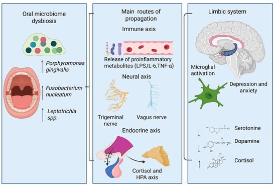 Recent studies have linked periodontal pathogens to the etiology and pathophysiology of depression and anxiety disorders [131]. In a survey of self-reported anxiety and depressive symptoms among adolescents, no significant differences were observed in oral microbiome diversity between the anxiety or depression groups and controls. Nonetheless, these symptoms correlated with altered relative abundances of specific taxa, including a positive association of Spirochaetaceae with both anxiety and depression, as well as positive correlations of Actinomyces, Fusobacterium, and Leptotrichia spp. with depression. Additionally, Leptotrichia spp. relative abundance positively correlated with cortisol levels [132,133]. Furthermore, in a non-clinical adult population, the overall composition of the oral microbiome, together with diurnal fluctuations in the relative abundance of bacterial taxa, varied with psychological distress and affective state [129].