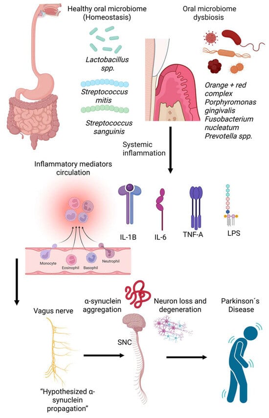 In PD, elevated gingival crevicular fluid IL-1β signals local inflammation, and poor oral health worsens progression [70]. α-synuclein (ASN) levels in saliva correlate with disease duration and severity, serving as a non-invasive biomarker. Periodontitis-driven systemic inflammation disrupts blood–brain barrier integrity, activates microglia, and promotes immune cell brain infiltration [67,71,72,73,74].