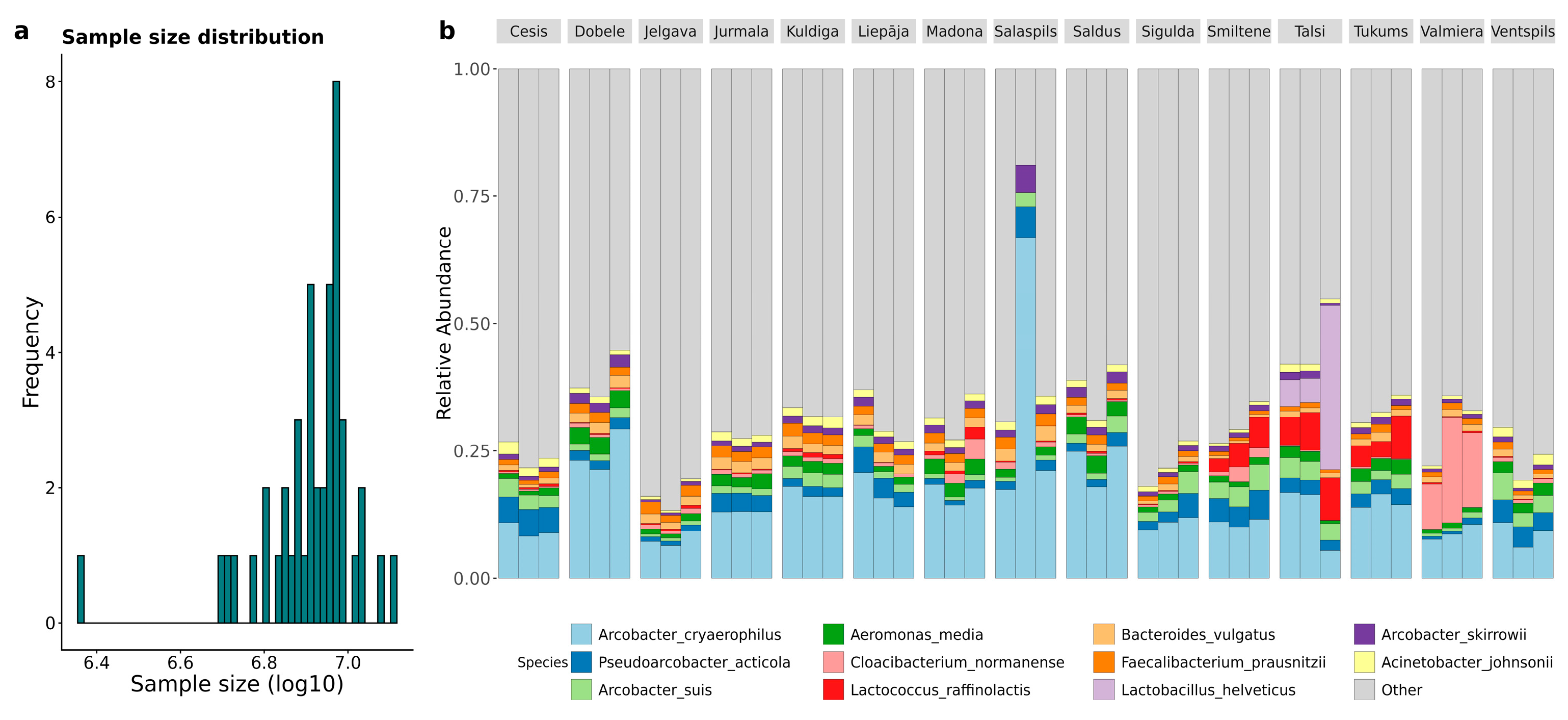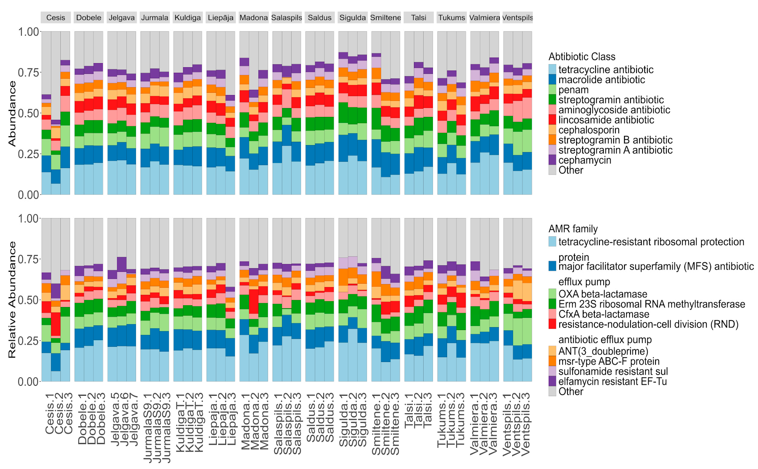 - Jurmala contained RSA1-1 and YajC, whereas Dobele showed tet(H), Erm(35), tet(T), catB8, and floR.