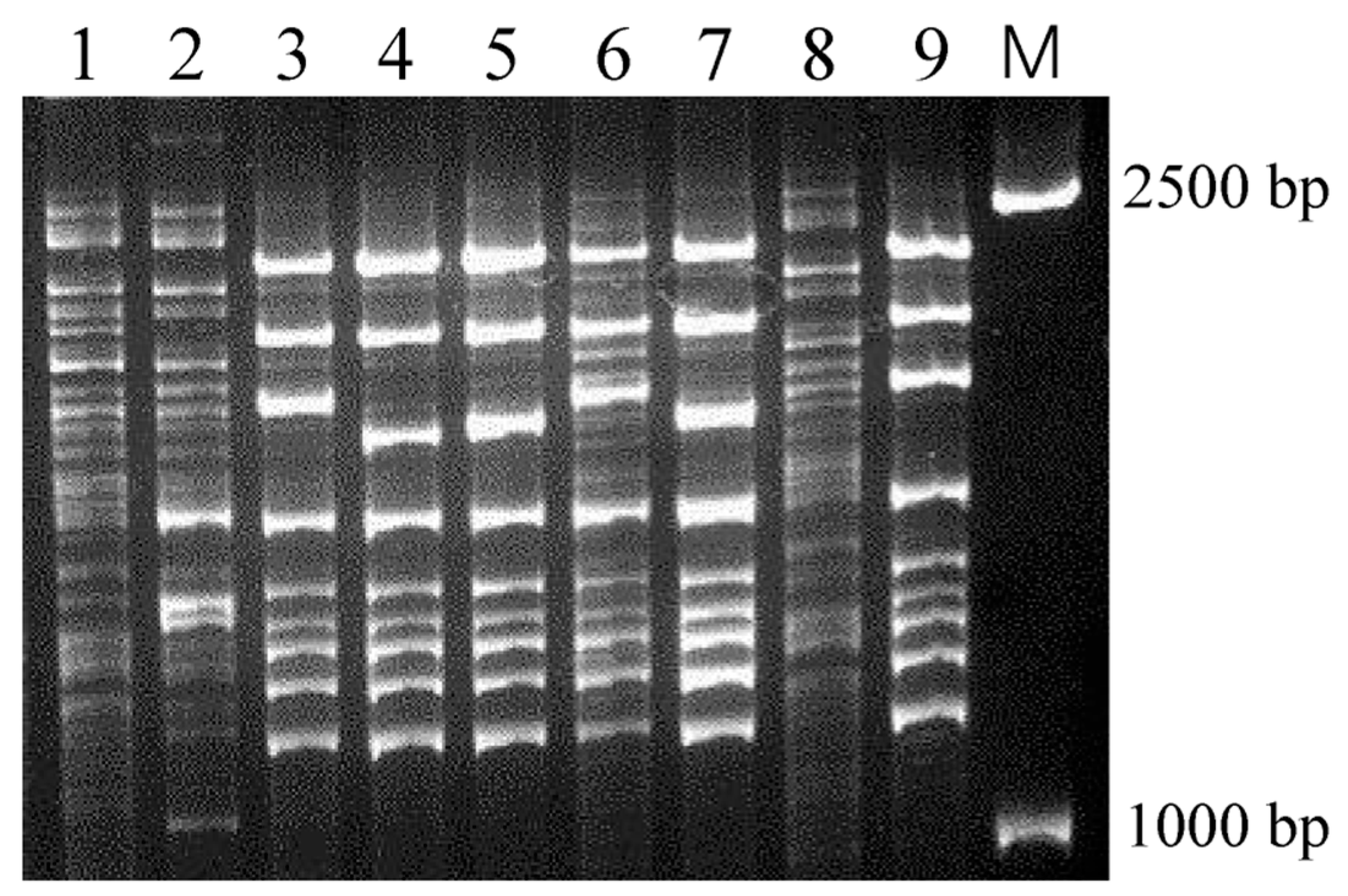 - Garaizar, J.; López-Molina, N.; Laconcha, I.; Baggesen, D.L.; Rementeria, A.; Vivanco, A.; Audicana, A.; Perales, I. Suitability of PCR Fingerprinting, Infrequent-Restriction-Site PCR, and Pulsed-Field Gel Electrophoresis, Combined with Computerized Gel Analysis, in Library Typing of Salmonella Enterica Serovar Enteritidis. Appl. Environ. Microbiol. 2000, 66, 5273–5281. [Google Scholar] [CrossRef]