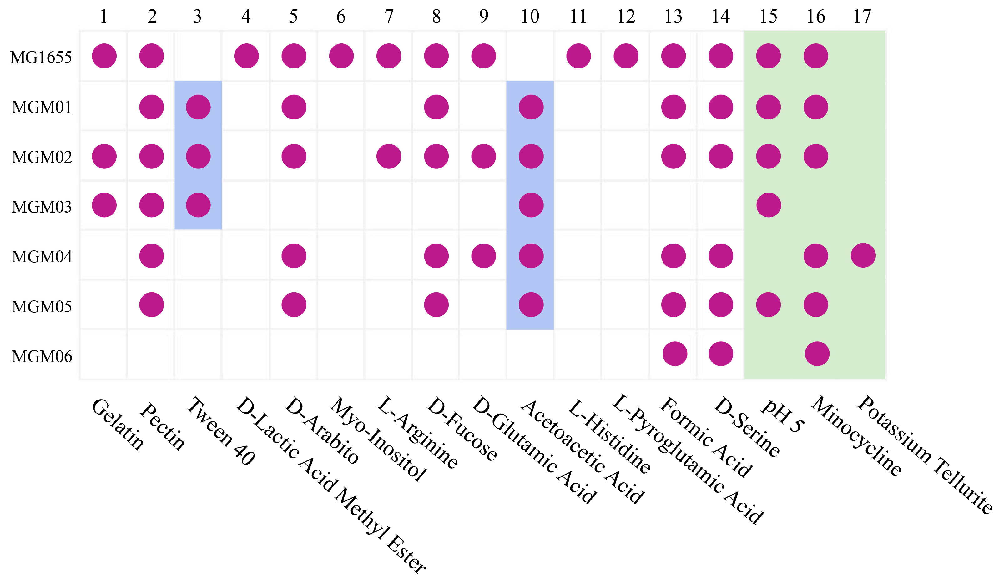 3.2. Biolog Assays Revealed Phenotypic Diversity of Six E. coli PRM Strains