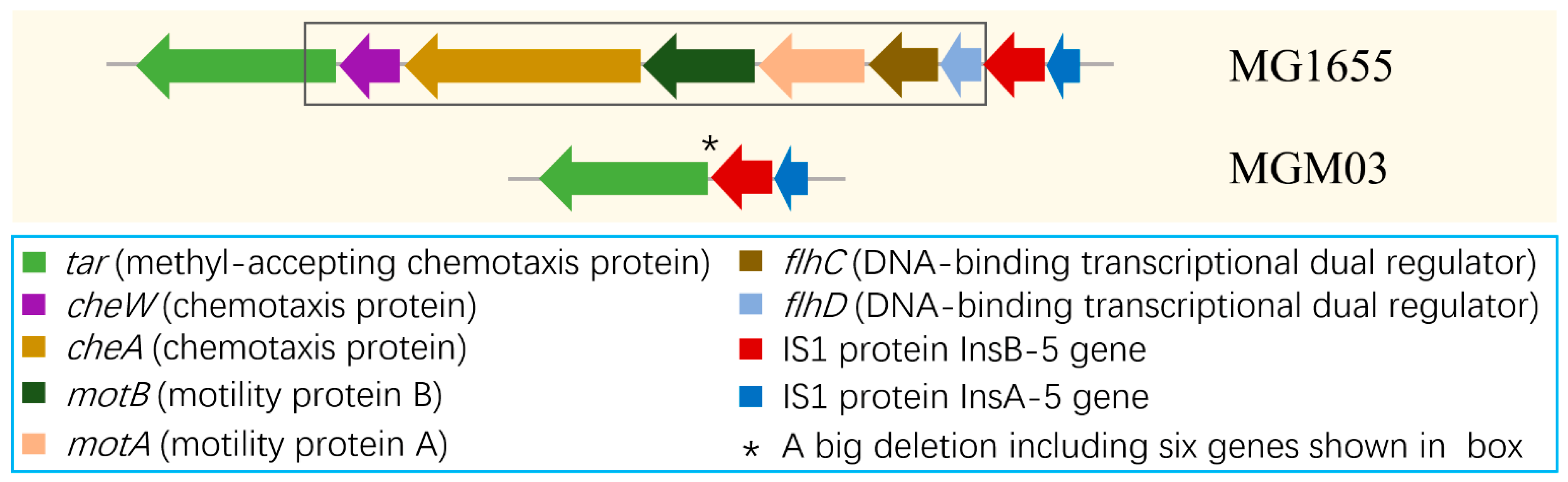 - Fahrner, K.A.; Berg, H.C. Mutations That Stimulate flhDC Expression in Escherichia Coli K-12. J. Bacteriol. 2015, 197, 3087–3096. [Google Scholar] [CrossRef] [PubMed]