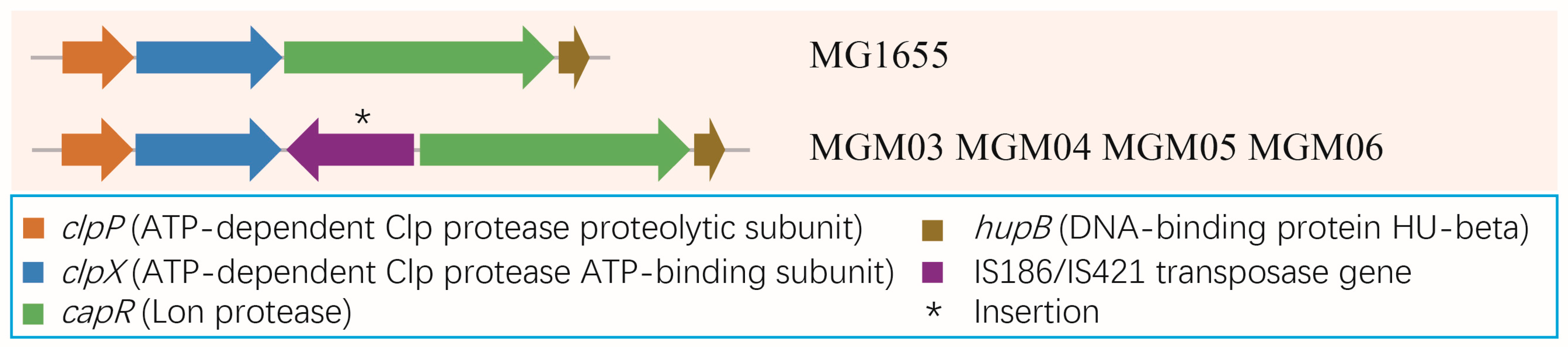 - Lee, H.; Doak, T.G.; Popodi, E.; Foster, P.L.; Tang, H. Insertion Sequence-Caused Large-Scale Rearrangements in the Genome of Escherichia coli. Nucleic Acids Res. 2016, 44, 7109–7119. [Google Scholar] [CrossRef]
