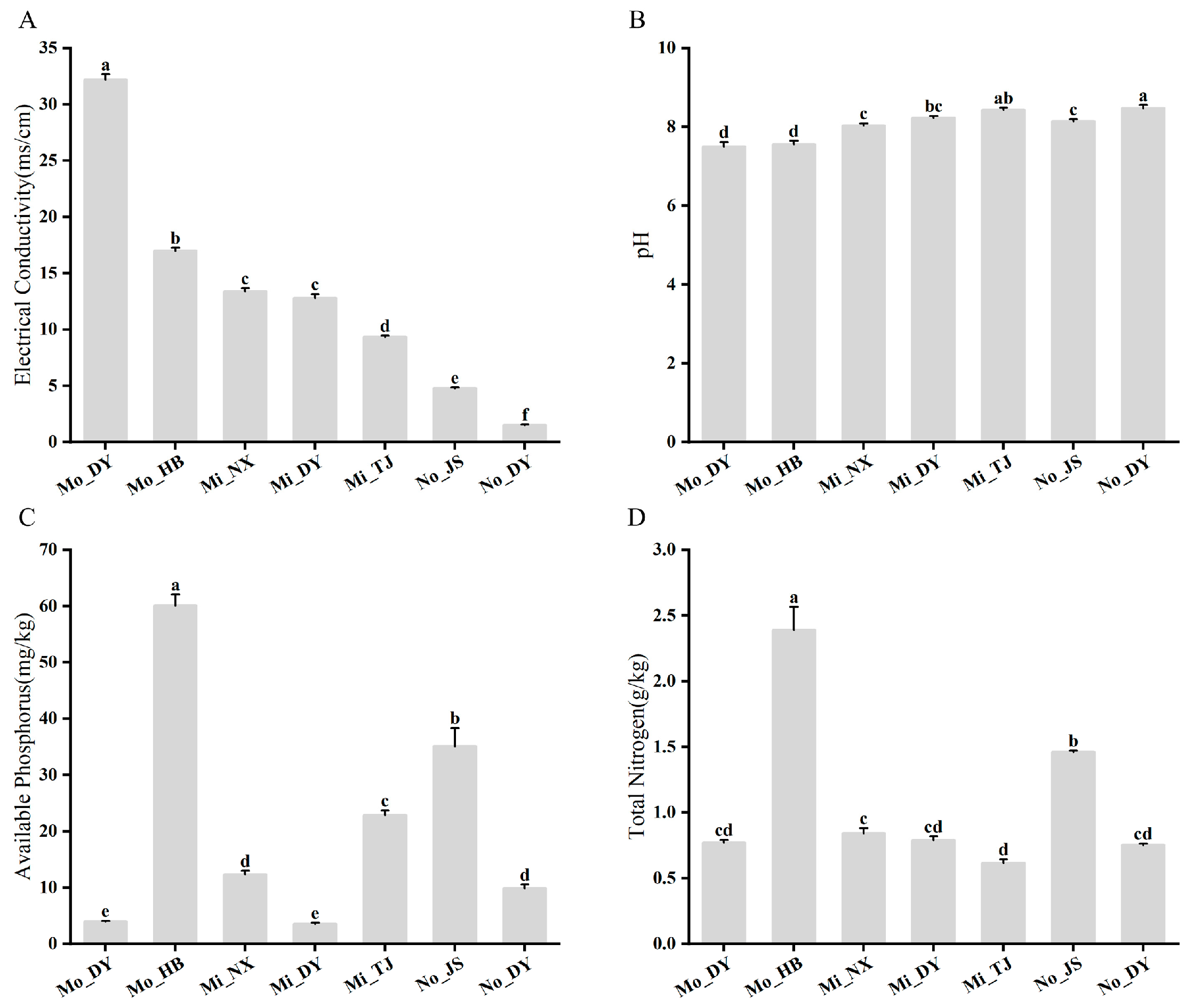 - Zhao, Y.; Li, T.; Shao, P.; Sun, J.; Xu, W.; Zhang, Z. Variation in bacterial community structure in rhizosphere and bulk soils of different halophytes in the yellow river delta. Front. Ecol. Evol. 2022, 9, 816918. [Google Scholar] [CrossRef]