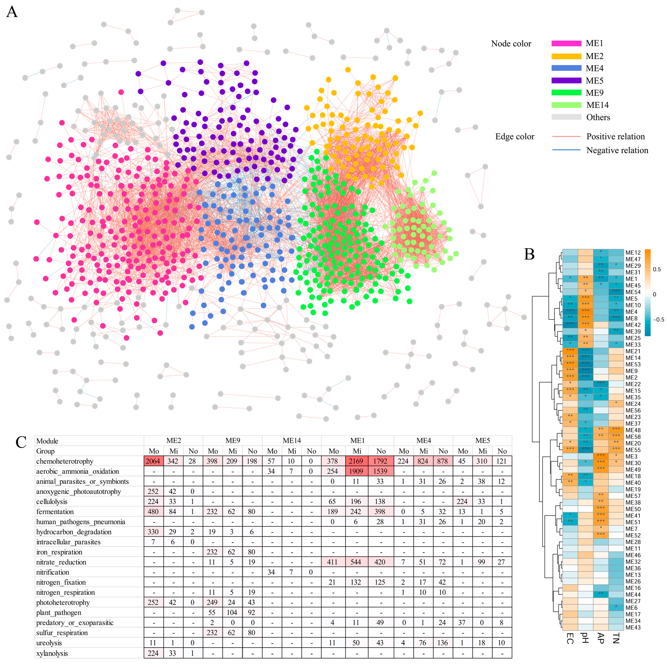 - Ma, B.; Wang, H.; Dsouza, M.; Lou, J.; He, Y.; Dai, Z.; Brookes, P.C.; Xu, J.; Gilbert, J.A. Geographic patterns of co-occurrence network topological features for soil microbiota at continental scale in eastern China. ISME J. 2016, 10, 1891–1901. [Google Scholar] [CrossRef]