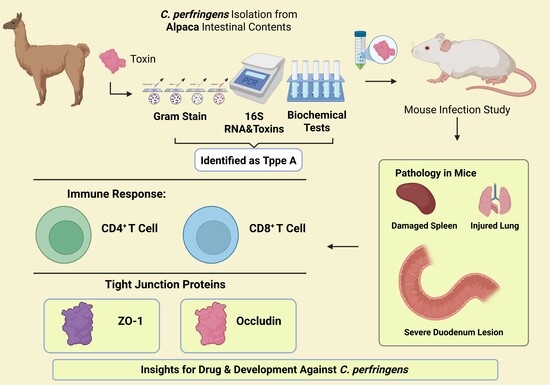 - Guan, P.; Yong, Y.; Huang, Z.; Chen, S.; Wang, H.; Liu, W. Isolation and identification of a Clostridium perfringens strain from alpaca. Shanghai Livest. Vet. News 2020, 22–23. (In Chinese) [Google Scholar]