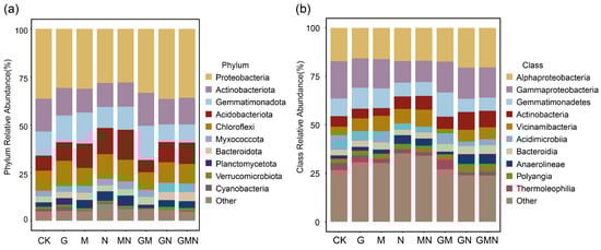Relative abundance of soil bacterial communities at the phylum (a) and class (b) ranksunder different treatments. CK, control; G, RAE; M, Trichoderma; N, cattle manure; MN, Trichoderma and cattle manure; GM, RAE and Trichoderma; GN, RAE and cattle manure; GMN, RAE and Trichoderma and cattle manure.