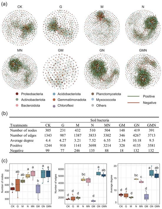Co-occurrence network analysis of soil bacterial communities under different treatments. (a) Network structures at the phylum level, where nodes represent bacterial taxa and edges indicate significant correlations (green: positive; red: negative). (b) Topological properties of bacterial networks, including the number of nodes, edges, and average degree. (c) Boxplots showing statistical comparisons of network metrics across treatments. RAE treatments (G, GN, GMN) notably enhanced network complexity, with GN and GMN exhibiting the highest numbers of edges and average degrees, indicating stronger microbial connectivity and cooperative interactions. Different letters above boxplots denote significant differences among treatments (p < 0.05).