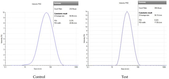 AgNPs were synthesized in the presence of SMF (test, 7 mT) and compared to a control sample without the magnetic field by DLS to further evaluate the effect of magnetic field strength. Figure 3 reveals that the test AgNP sample exhibited a hydrodynamic size of 36 nm, indicating relatively smaller nanoparticles. Furthermore, the PDI value of 0.22 indicated a nearly monodisperse particle distribution with minimal size variations. In comparison, the control sample, synthesized in the absence of the magnetic field, exhibited a larger hydrodynamic size of 57 nm. The PDI value of 0.27 indicated a moderate level of polydispersity, suggesting a broader size distribution compared to the test AgNP sample.