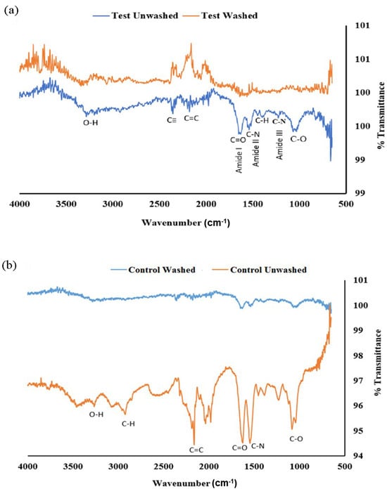 FTIR analysis of (a) AgNPTest and (b) AgNPControl revealed multiple peaks in the unwashed condition, indicating the presence of various functional groups on the nanoparticle surfaces.