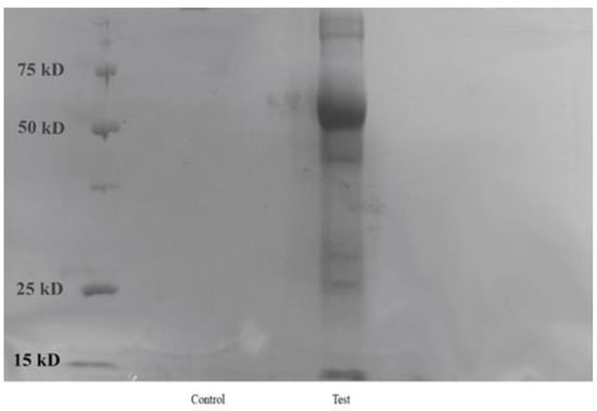 To analyze adsorbed proteins on both the control and test samples of AgNPs, we boiled the nanoparticles in SDS-PAGE sample buffer to denature and solubilize proteins. We then centrifuged the mixture at 10,000× g for 15 min to pellet the nanoparticles, separating them from the supernatant. The supernatant, which contained the proteins, was loaded onto an SDS-PAGE gel for analysis. Low molecular (between 15 and 25 kD) and high molecular mass proteins (about 50 kD) can both be seen in the AgNP (Test) lane of the SDS-PAGE gel image, as illustrated in Figure 8.