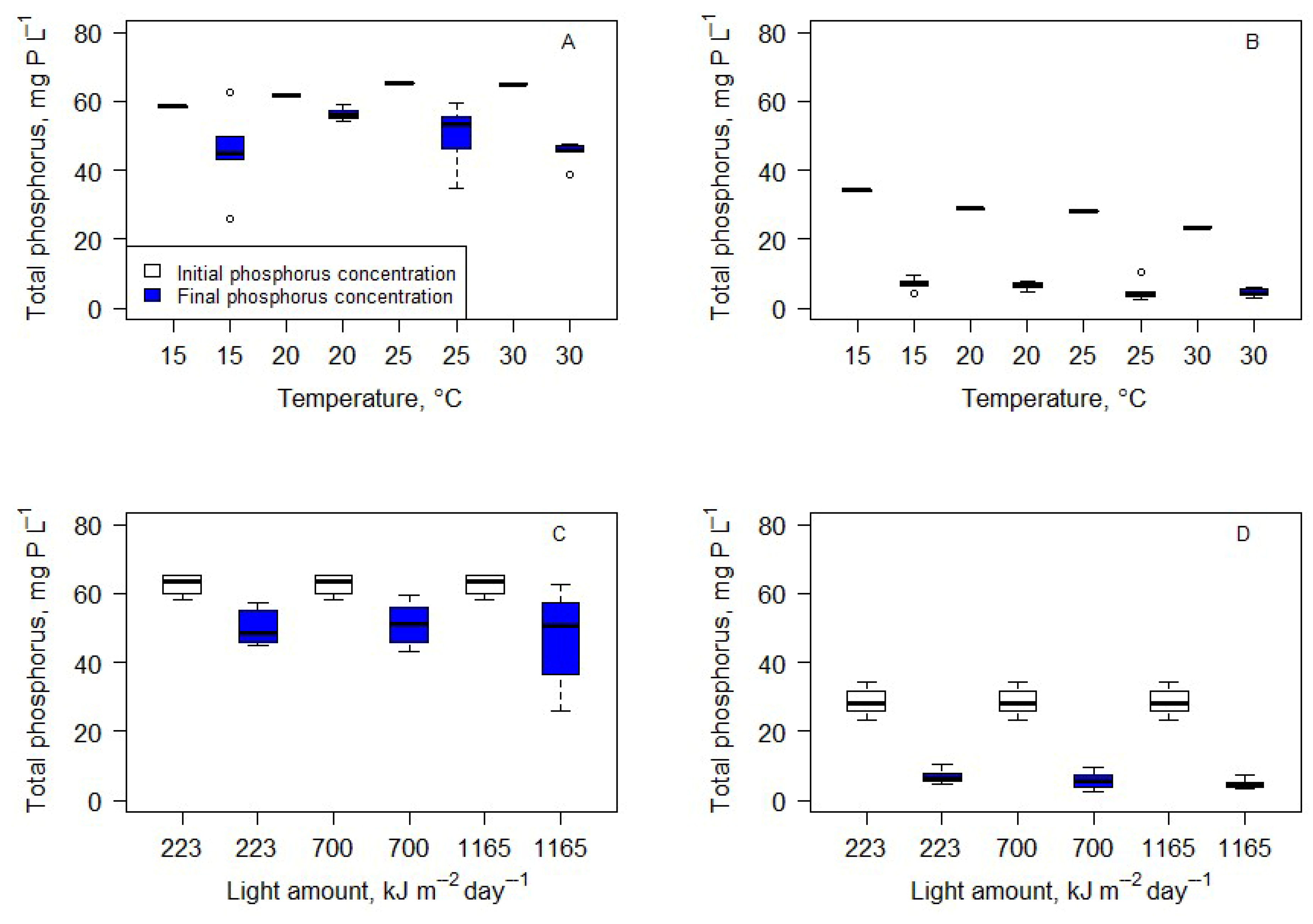 3.1. Effect of Environmental Conditions on Phosphorus and Nitrogen Concentration Changes