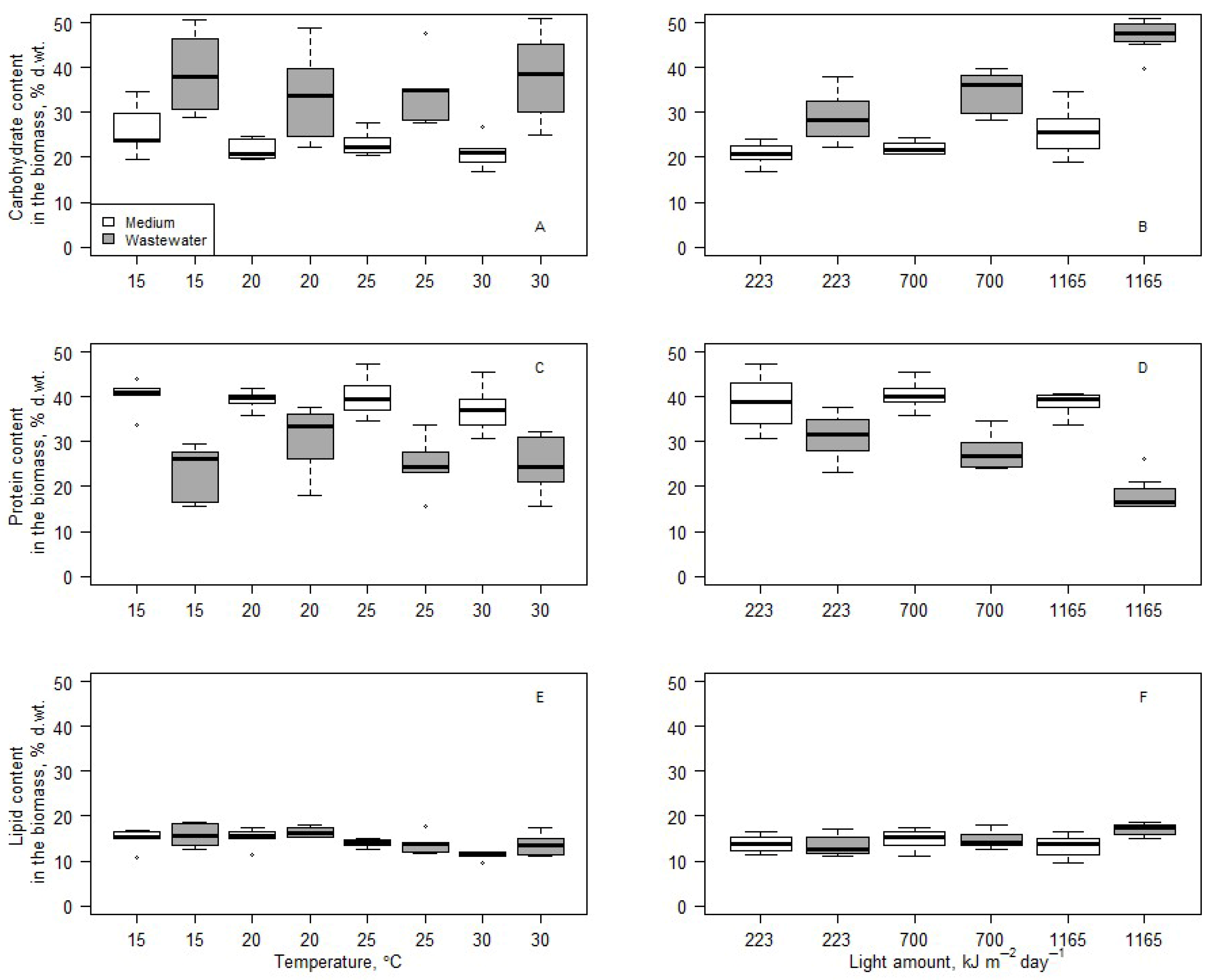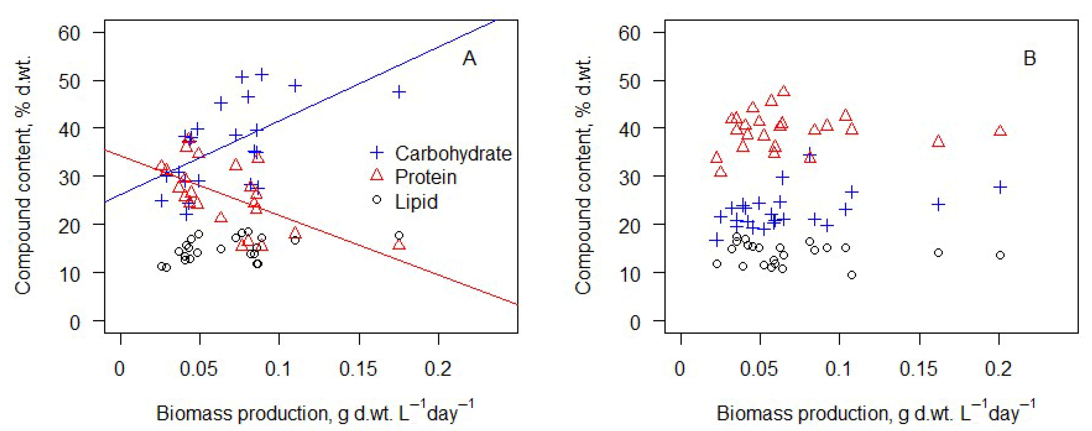3.4. Effect of Environmental Conditions on Culture Biomass Biochemical Composition